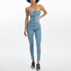 Pagliaccetto estivo da donna in jeans con spalle scoperte e casual elasticizzato in denim shorts da donna